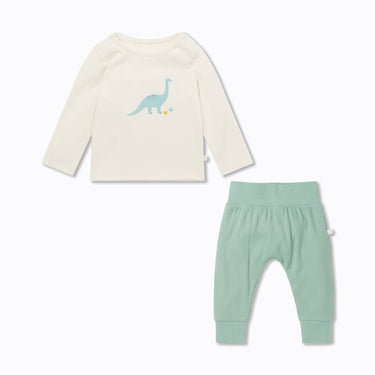Our Dino Tee & Ribbed Joggers is the perfect outfit for little ones who love to play. Both are crafted from the softest sustainable fabrics to keep them comfortable all day. The dino print top has poppers on the back up to 2 years for easy dressing & the joggers have an elasticated waistband.
