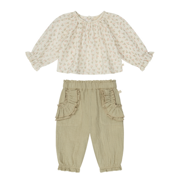 Floral Muslin Bloomer Blouse & Sage Muslin Frilled Pants Outfit