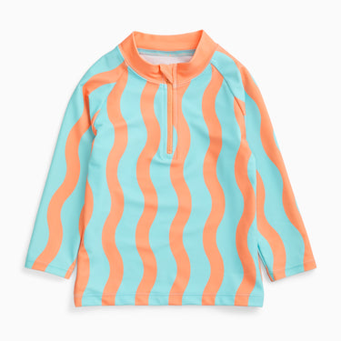 Make sunny days safer with our KIDLY by MORI Rash Guard in Orange Wavy Stripe. Crafted from UPF 50+ recycled fabric with a front zip for easy on and off after water play.