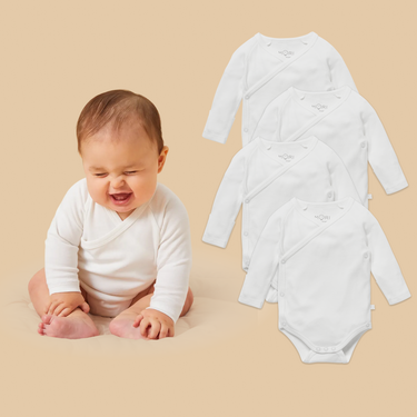 Our Long Sleeve Kimono Bodysuit 4 Pack is crafted from our signature bamboo and organic cotton fabric, to ensure only the softest touch on baby’s sensitive skin. Designed for both style and practicality, the baby bodysuits feature a wrap-style front with poppers for fuss-free dressing.