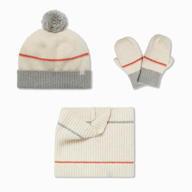 Wrap them up for chilly adventures in our organic cotton Knitted Beanie Hat, Snood & Mittens Set. The beanie style hat has a ribbed trim for extra warmth and adorable bobble. The hat and mittens are finished with organic cotton jersey lining.