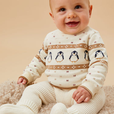 Brrr-ing on the chilly day adventures in this cute and comfy knitted outfit. The festive sweater is decorated with fair isle penguins and features easy buttons on the back.