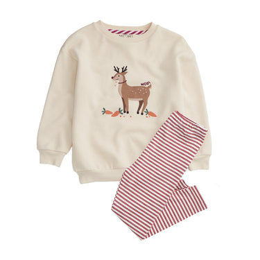 Made for festive outings and cozy playdates, our Reindeer Sweater & Red Stripe Leggings Outfit is a comfy, cheerful combo. Featuring an oversized cream sweater with a playful reindeer face and stretchy red striped leggings, it's a ready-to-go look for merry days.