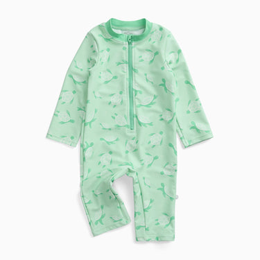 Designed for paddling and play, our Sea Turtle Sunsafe One-Piece Rashguard features a playful green turtle print and clever features like a front zip and poppers for easy changes.