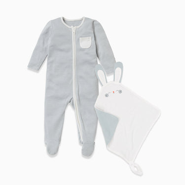 Little ones will sleep soundly with our Zip Baby Pajamas & Comforter Set. Crafted in organic cotton and bamboo from viscose fabric, the footed baby pajamas have a zip along the front to make dressing and changing your baby or toddler simpler. The comforter is made in our softest signature fabric with an adorable bunny face and loop attachment so your little one can cuddle up anywhere.